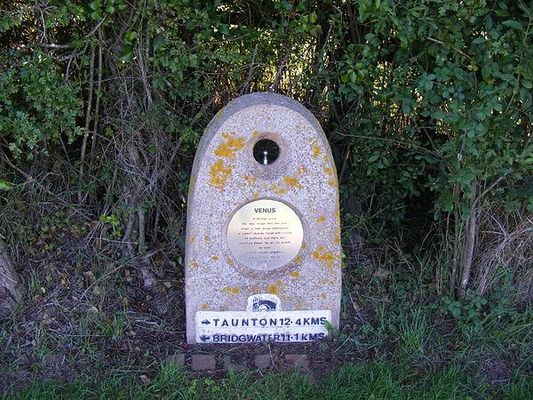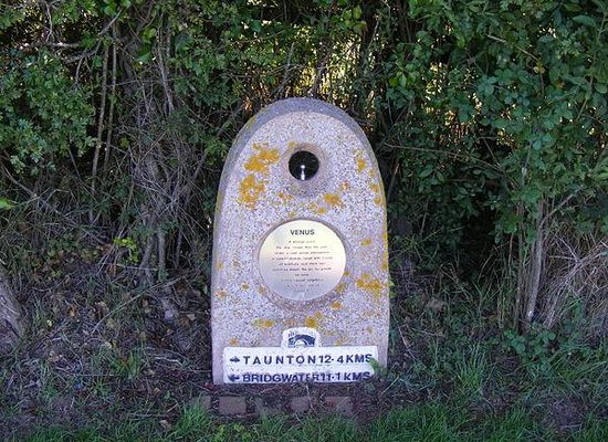 The Somerset Space Walk is a sculpture trail model of the Solar System, located in Somerset, England. The model uses the towpath of the 22-kilometre Bridgwater and Taunton Canal to display a model of the Sun and its planets in their proportionally correct sizes and distances apart. Unusually for a Solar System model, there are two sets of planets, so that the diameter of the orbits is represented.