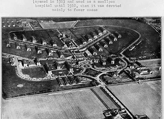The hospital was planned in the late 19th century to accommodate sufferers of smallpox, which had reached epidemic levels in London. It replaced three hospital ships based nearby in Long Reach, Gravesend 15 miles downriver from London Bridge on the Thames.[Note 1] The ships, the Atlas, the Endymion and the Castalia, were made fast in 1883 at their new custom built moorings, they were in-line, connected by bridges 150 yard from the riverbank. The ships had become unsuitable for their role due to increasing maintenance costs, the risk of collision from passing ships and the increasing demand for beds for smallpox patients.