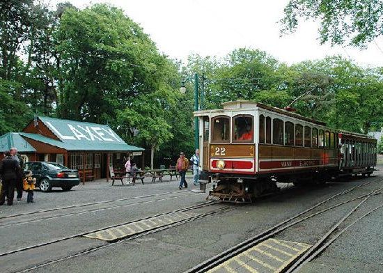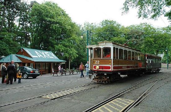 The tin-roofed station building dates from the early years of the line and features the station name in large lettering painted on its roof. This building houses a booking office and a café as well as the station toilets, and was extensively refurbished in 1994, marking the centenary of the tram service to the village, though not on this site.