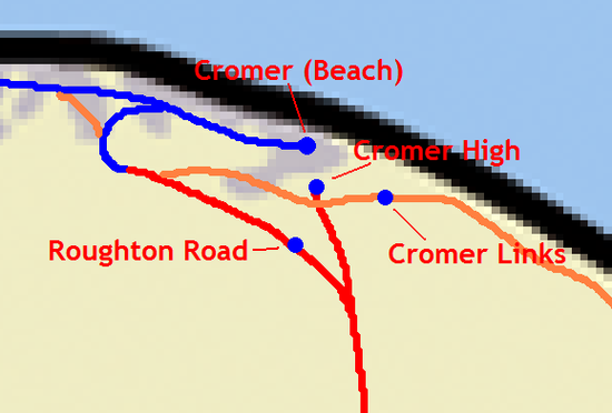 The fishing port and holiday resort of Cromer in the English county of Norfolk has had a rail service since 1877. It was served by three railway stations for many years, and is now served by two. Cromer Beach station, which opened in 1887, was renamed Cromer following the closure of the other early stations.