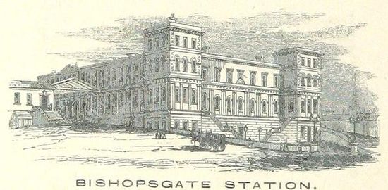 Bishopsgate was a railway station located on the eastern side of Shoreditch High Street in the parish of Bethnal Green on the western edge of the East End of London and just outside the City of London.