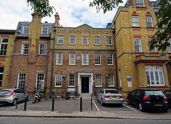 The original hospital block is a mid-18th century brown brick house with a Roman Ionic porch. It was the home of the poet James Thomson , who lived there from 1736 until his death. The site is marked by a blue plaque. Thomson wrote his most famous works there including the masque Alfred, which includes the poem "Rule, Britannia" , "The Castle of Indolence" and "The Seasons" . His poem "Rule, Britannia" was set to music by Thomas Arne in 1740 and became a patriotic song. There is a memorial to him in Richmond Park.