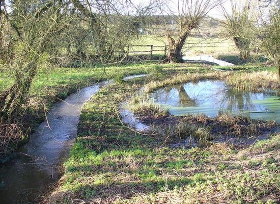 The stream runs, WNW then north, about 7 km in the Vale of Holmesdale . It mainly rises in the former manor farms and common land of Peaslake on the northern slopes of the Greensand Ridge. It drains much of the northern Winterfold Forest/Hurtwood: the upper half of the drainage basin is forest with some pasture save for the large hamlet itself. The stream waters the clustered village of Brook/Little London in Albury. On the left bank the stream has, after its coalescence of headwaters, the northern lands of Farley Green then briefly a low corner of Blackheath, Wonersh – a sparsely-inhabited wooded plateau, on the opposite bank of the closest-to-village fields of Albury's main settlement, including a further former millhouse.