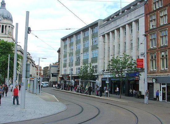 Old Market Square is a tram stop of Nottingham Express Transit in the centre of the city of Nottingham. It is situated on the South Parade of Nottingham's Old Market Square, from which it derives its name, and is the most central of the system's stops. The location is a high-profile one, benefiting from the long views and high pedestrian footfall of the market square. It is also adjacent to the city's Council House, and is an important interchange point with the city's buses.