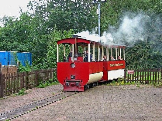 The Telford steam tram at the Telford Steam Railway of the Telford Horsehay Steam Trust, runs on a 2 ft narrow gauge track. This follows a short circular route, part of which runs near to the lake known as Horsehay Pool. Prior to the completion of the circle after arriving near the loco shed, it paused very briefly before returning, coach first, to the starting point near the entrance.