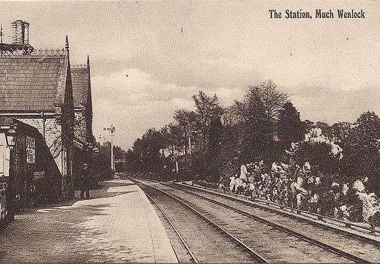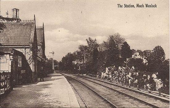 The original Much Wenlock railway station was opened 1 February 1862 by the Much Wenlock and Severn Junction Railway, linking Buildwas with Much Wenlock. The line later formed part of the Wellington to Craven Arms Railway and was, for much of its working life, operated by the Great Western Railway. The original, but temporary, dead-ended station - whose buildings are now the club house of Much Wenlock Bowling Club. - was replaced by the through station illustrated - about ¼ mile further east - at some date between March and September 1866 .