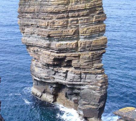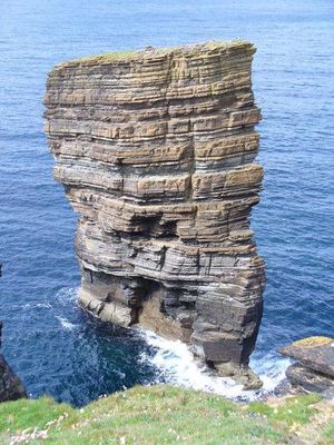 North Gaulton Castle is a sea stack off the western coast off the Orkney main island. It is formed from the red sandstone of the area and is about 165 feet high. It was climbed in 2017 by four climbers using a Tyrolean traverse.