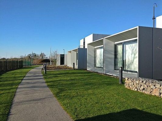 Dyson Institute Village was built in 2019 on the outskirts of Malmesbury, Wiltshire, England, to provide on-campus student housing for the Dyson Institute of Engineering and Technology. The village was designed as a number of stacked studio apartment modules by London architects WilkinsonEyre, and modelled after Montreal's Habitat 67. The pods are constructed from cross-laminated timber and each pod is wrapped in aluminium. A feature of the modular system is that each pod is connected to the others with only four bolts.