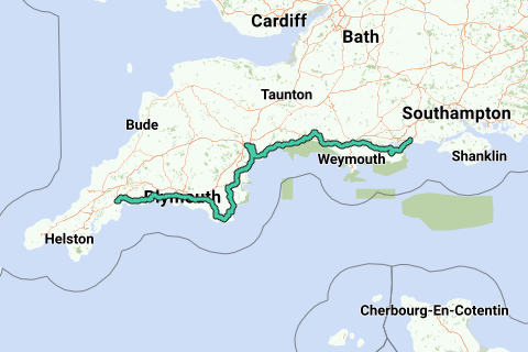 Cycling Tour from Bournmouth to St Austell Cornwall, UK. Approximately following incomplete NCN N2 route