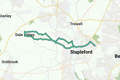 Starting in Stapleford, walk towards "cardboard hill" and then under the M1 to the golfcourse. Continue through Stanton to the Dale Abbey ruin & caves, and thereafter the Dale Abbey pub. Return route runs parallel to the out-path: Stanton, golfcourse, down "cardboard hill", and back on the canal path.