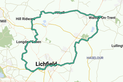 Through Lichfield the very gentle flat quiet lanes, over the A38 to Yoxall and a bit busier and a little more undulating. Then accross the A51 and it is more undulating than expected, nice downhill home.
