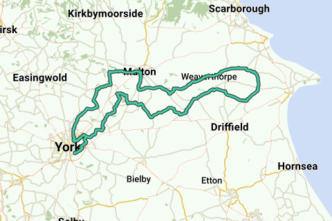 Action Medical Research ride www.action.org.uk/york100. On road. Anticlockwise from the University of York, Heslington. Heads out into the Yorkshire Wolds towards the coast via Thixendale and Sledmere, turning round at Burton Fleming and then coming back to York via Malton and the Castle Howard estate.