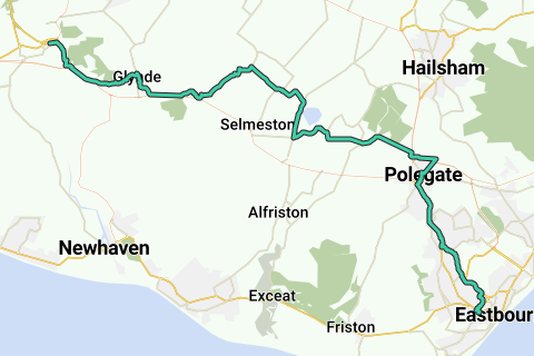 start at Eastbourne station, on road and off road (Abbotts Wood etc) using cycle paths. Can go a different route from start to Polegate via Bannatynes Gym if you want to use cycle paths only