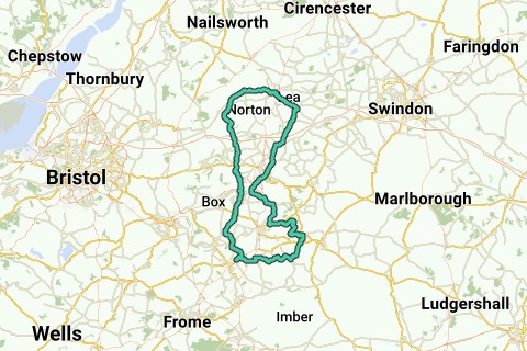 Circular route taking in Malmesbury, Chippenham, Lacock, Rowde, Keevil and back to Trowbridge
