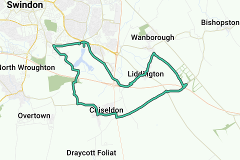 Coate water down Day House Lane, through Badbury then Liddington and into Wanborough. Turn right towards King Edwards place. At the end turn right towards the motorway. Turn onto Ridgeway path down to Chiseldon. Cross over main road by petrol station. Head towards Patriot arms turn right and on the bend take path back to Coate water and the finish
