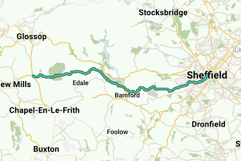 Route over to Sheffield from Hayfield, taking in views of the Peak District.
