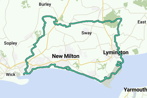 to lymingon along the cliffs and coast path, inland and round to Brockenhurst then railway round to Holmsley and back to Mudeford