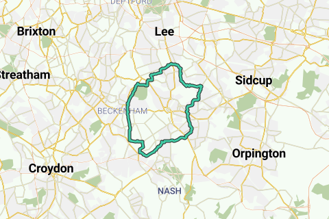 Circular route through Beckenham Place Park, to Elmstead Wood then Southborough and Bromley Common. Updated to avoid (1) tricky barriers on approach to Elmstead Woods and (2) footpath between Sundridge golf course and houses.
