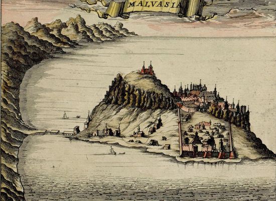 Monemvasia means 'single entrance'. That quality as a peninsula gave it a uniqye geographical and strategic position. In the 6th century, the Greeks from Laconia fled here from the Slavs. By the 13th century, it became the commercial centre of the Peloponnese. The famous Malmsey Wine was shipped from this point. Malmsey is the English name for Monemvasia.