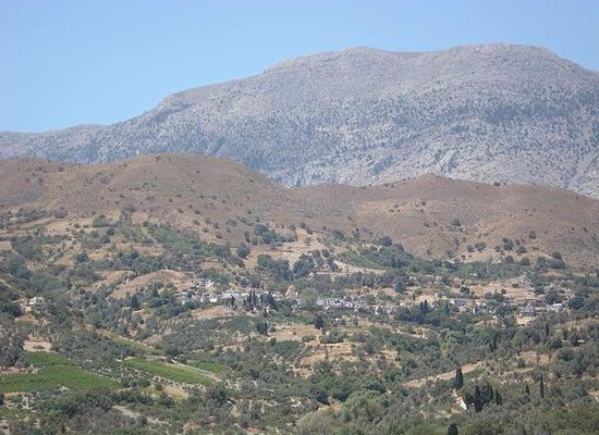 Prinias is an archaeological site in Crete that has revealed a seventh-century BCE temple with striking similarities to ancient Egyptian architecture, including an Egyptianised seated goddess. It is 35 kilometres southwest of Iraklion, about halfway between Gortyn and Knossos. Above the site is a peak sanctuary, a sub-Minoan survival.