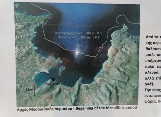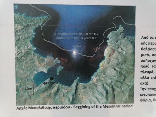 This is the shoreline of 10,500 years ago. Temperatures kept rising, and so did the sea level due to meling of ice. The level of the sea was -50m vs the current level. A Neolothic settlement was found in the sea, but obviously at that time it was still land. The island of Koronida was at that time not an island but part of the main land.
