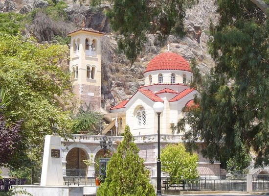 Here, where the carbonate mountains end and the fertile “Plain of Argos” begins, large quantities of water, from subterranean waterways, emerge from a large karst spring. The karst water runs in the river Erasinos (in ancient times a river god[3]) towards the sea to the Argolic Gulf at the village of Nea Kios. The Kefalari spring's outlet is framed by walls and rows of Platanus trees. Orthodox church dedicated to the “Blessed Virgin Mary” is placed above Kefalari karst spring “Zoodochos Pigi”