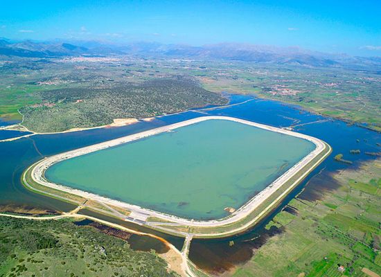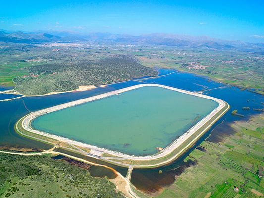 The Polje of Tripolis is a large basin (a polje at about 650 m in altitude, a length of ca. 30 km and a width between 12,5 and 2,5 km). The Tripoli Basin has gradually been rainwater regulated (mainly after 1945 ) and turned into farmland. In the southwest floods, which appear in the basin occasionally after rainy winters, as in 2003, formed the temporary Lake Taka. This lake was regulated by a new pond, to retain water for irrigation.