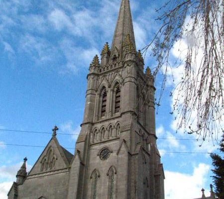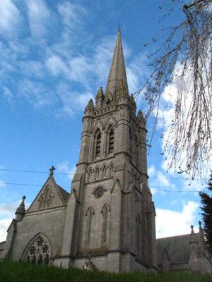The Church of Ireland Adelaide Memorial Church of Christ the Redeemer in Myshall is a miniature version of Salisbury Cathedral. Completed in 1913, Dover-based businessman, John Duguid, commissioned it in memory of his daughter Constance, who was killed in a horse riding accident while visiting her sister in Myshall, and her mother Adelaide, who died in 1903. Both are buried here.