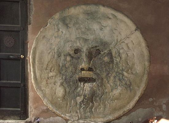 The Mouth of Truth is a marble mask in Rome, Italy, which stands against the left wall of the portico of the Santa Maria in Cosmedin church, at the Piazza della Bocca della Verità, the site of the ancient Forum Boarium . According to enduring medieval legend, it will bite off the hand of any liar who places their hand in its mouth, or, alternatively, any who utters a lie while their hand is in the mouth. It still attracts many visitors who audaciously insert their hands.