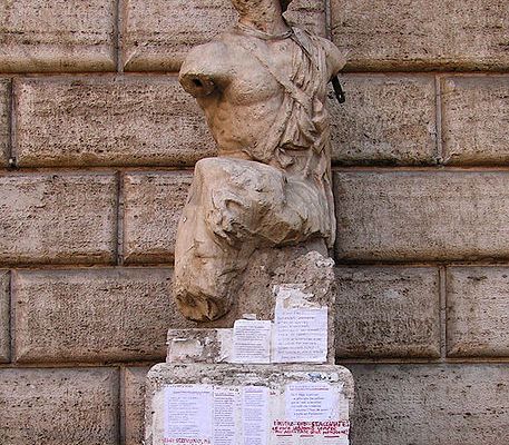 Pasquinade refers to an anonymous lampoon, whether in verse or in prose. Pasquin (Italian Pasquino, Latin Pasquillus) was the name ordinary Romans gave to a battered ancient statue (from a Hellenistic-style group, probably of the 3rd century BC) dug up in the course of paving the Parione district and erected at the corner of Piazza di Pasquino and Palazzo Braschi, on the west side of Piazza Navona in 1501, by Cardinal Oliviero Carafa, who inadvertently gave the statue its first voice, by originating an annual ceremony, the first in 1501, for Saint Mark's Day, April 25. The marble torso was draped in a toga, and epigrams in Latin were attached to it.