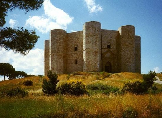 Castel del Monte or Castle of the Mount was constructed during the 1240s by the Emperor Frederick II. The site is protected as a World Heritage Site. One theory states that the octagon is an intermediate symbol between a square (representing the earth) and a circle (representing the sky). Frederick II may have been inspired to build to this shape by either the Dome of the Rock in Jerusalem, which he had seen during the Sixth Crusade, or by the Palace Chapel of Aachen Cathedral.
