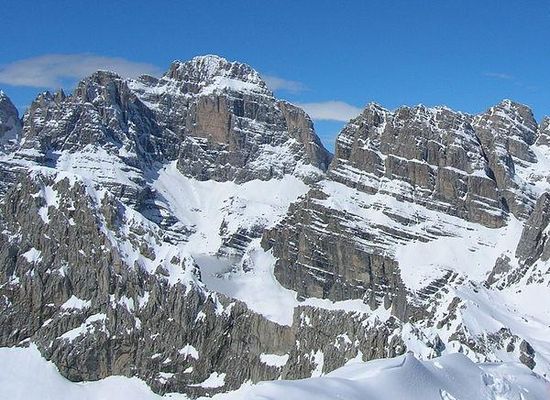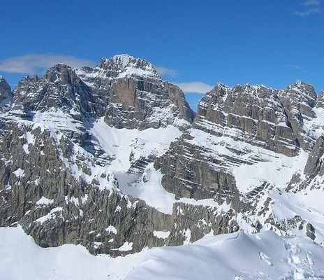 Cima Brenta is the highest mountain in the Brenta group , a subgroup of the Rhaetian Alps in the Italian Region of Trentino-Alto Adige, with a reported height of 3,150 metres . The mountain rises imposingly up between the rock towers and pinnacles of the central Brenta Group. A sharp ridge connects the mountain on its southern side to the Spallone die Massodi. The northern ridge steeply descends towards Bocca del Tuckett. Towards north west a slender couloir descends all the way from the top towards the Vedretta di Brenta Inferiore, the mountain's 'lower' glacier. Large shouldering formations extend towards the west, culminating in the Cima Mandrone and the Punti di Campiglio, and northwest, culminating in the Cima Massari. Above these formations a glacier, the Vedretta di Brenta Superiore, the 'upper' glacier descends the mountain, being cut off by a vertical precipice over the Vedretta di Brenta Inferiore. On the eastern side the mountain rises up with an imposing 700-meter high vertical rock face with on its left side a distinct orange-like color. Above this lies a horizontal ledge, the Cengia Garbari, on which the Via delle Bocchette Alte proceeds. The actual mountain has two summits that are some 250 meters apart, of which the eastern top reaches the highest altitude. The glaciers, vedrette, have been shrinking steadily over the last decades as a result of climate change.