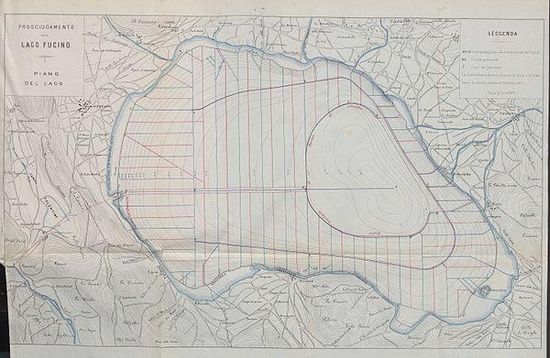 The Fucine Lake was a large endorheic lake in western Abruzzo, central Italy, stretching from Avezzano in the northwest to Ortucchio in the southeast, and touching Trasacco in the southwest. Once the third largest lake in Italy, it was drained in 1878.