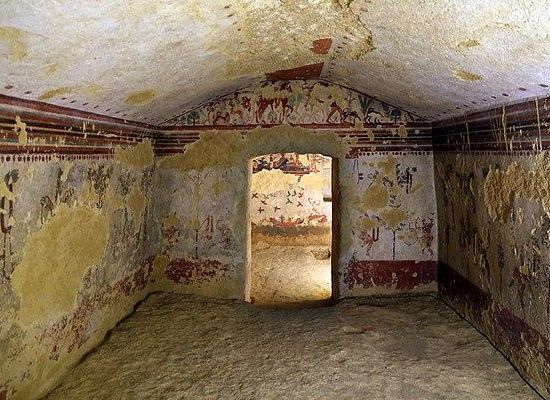 The Tomb of Hunting and Fishing , formerly known as the Tomb of the Hunter , is an Etruscan tomb in the Necropolis of Monterozzi near Tarquinia, Lazio, Italy. It was discovered in 1873 and has been dated variously to about 530–520 BC, 520 BC, 510 BC or 510–500 BC. Stephan Steingräber calls it "unquestionably one of the most beautiful and original of the Tarquinian tombs from the Late Archaic period." R. Ross Holloway emphasizes the reduction of humans to small figures in a large natural environment. There were no precedents for this in Ancient Greek art or in the Etruscan art it influenced. It was a major development in the history of ancient painting.