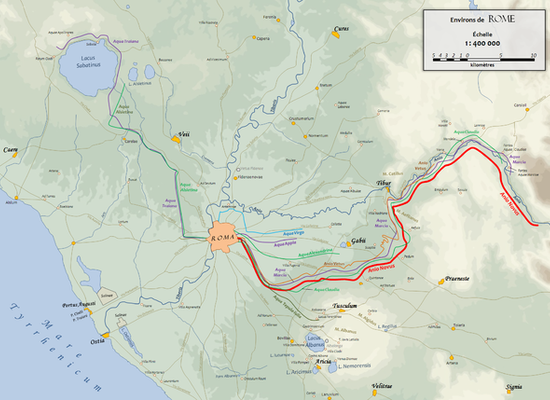 Aqua Anio Novus was an ancient Roman aqueduct. Like the Aqua Claudia, it was begun by emperor Caligula in 38 AD and completed in 52 AD by Claudius, who dedicated them both on August 1. Together with the Aqua Anio Vetus, Aqua Marcia and Aqua Claudia, it is regarded as one of the "four great aqueducts of Rome."