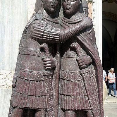 The Portrait of the Four Tetrarchs is a porphyry sculpture group of four Roman emperors dating from around 300 AD. The sculptural group has been fixed to a corner of the façade of St Mark's Basilica in Venice, Italy since the Middle Ages. It probably formed part of the decorations of the Philadelphion in Constantinople, and was removed to Venice in 1204 or soon after.