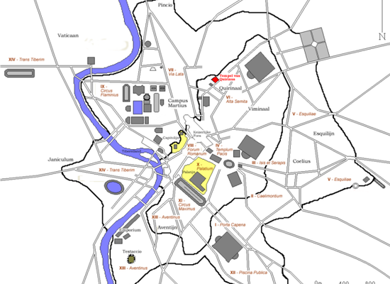The Temple of Quirinus was an ancient Roman temple built on the western half of the Quirinal Hill near the Capitolium Vetus, on a site which now equates to the junction between Via del Quirinale and Via delle Quattro Fontane, beside Piazza Barberini. Domitian later built the Temple of the gens Flavia nearby.