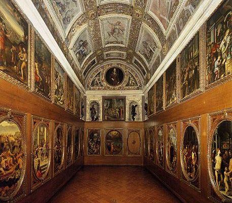 The Studiolo is a small painting-encrusted barrel-vaulted room in the Palazzo Vecchio, Florence, Italy. It was commissioned by Francesco I de' Medici, Grand Duke of Tuscany. It was completed for the duke from 1570-1572, by teams of artists under the supervision of Giorgio Vasari and the scholars Giovanni Batista Adriani and Vincenzo Borghini.