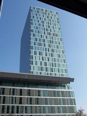 The Zuidas is a rapidly developing business district in the city of Amsterdam in the Netherlands. The Zuidas is also known as the 'Financial Mile'. It lies between the rivers Amstel and Schinkel along the ringway A10. The greatest influences for the development of the Zuidas are La Défense in Paris and Canary Wharf in London. In size it can best be compared with the Noordruimte/Espace Nord in Brussels.
