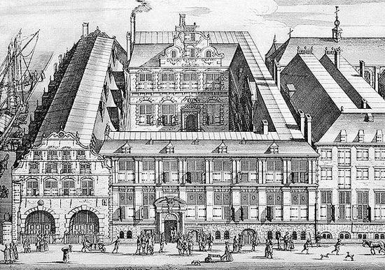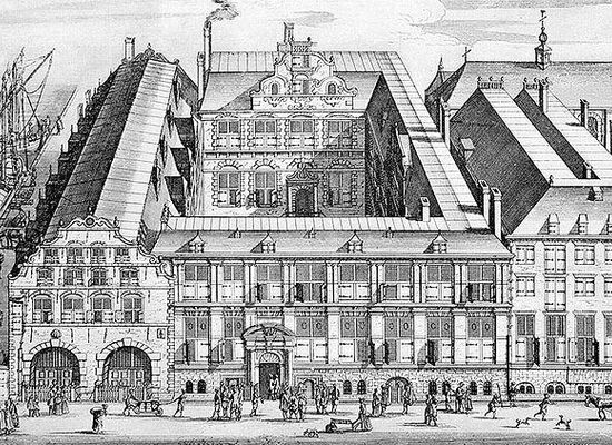 In 1603, the Amsterdam chamber of the East India Company began using part of the Bushuis armory on the Kloveniersburgwal canal as a warehouse. Two years later, the East India Company took over the whole building. However, the company still lacked meeting and office space, so a new building was constructed directly adjacent to the Bushuis. This building, completed in 1606, was called the Oost-Indisch Huis and was the first building especially built for the East India Company. In 1663-64, the western wing was extended. In addition, a northern wing was added, so that the building now also bordered the street Oude Hoogstraat. The last major extension was added between 1658 and 1661. A gate with Tuscan-style pilasters and a small tunnel lead to an inner courtyard with elegant facades in Amsterdam Renaissance style, a style closely identified with the architect Hendrick de Keyser, who was most likely responsible for designing the building.