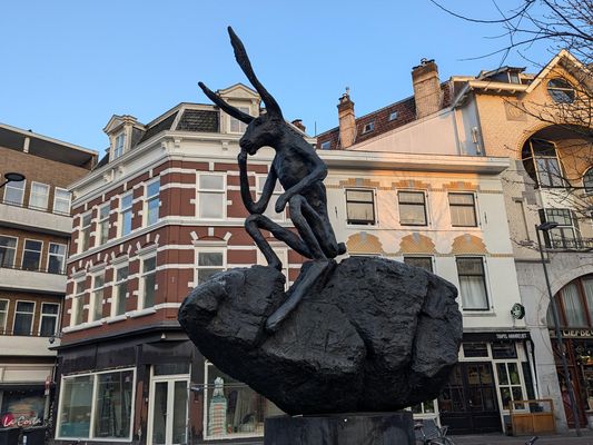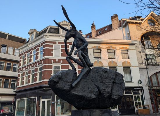 The statue Thinker on a Rock, better known as "The Hare", has been on the Neude since 2002 and was made by the British artist Barry Flanagan. The statue shows a hare in the same pose as Rodin's famous The Thinker. A fun fact is that this hare is regularly dressed by Utrecht residents: in the winter he gets a scarf and sometimes a bunch of carrots in his lap.