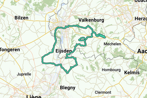 Start/finish: corner Marktstraat/Rijksweg Gulpen. Climbs: Ingberdorpsstraat Ingber 2400 m., max. 5.0%. Rue l' Etat Houtain-Saint-Siméon (B) 2000 m., max. 6.0%. Rue de Dalhem Visé (B) 1800 m., max. 4.0%. Côte de Dalhem Dalhem (B) 900 m., max. 7.0%. Heiweg Mesch 1600 m., max. 8.0%. Moerslag St. Geertruid 600 m., max. 6.0%. Banholtergrubbe Banholt 1700 m., max. 6.0%. Honthemmerweg Hontehm 800 m., max. 5.0%. Hoebesweg Bruisterbosch 500 m., max. 9.0%. Elevation gain: 678. Coffee stop: MêrSy, Voerenstraat 52, Voeren (B) (closed Mon/Tue).