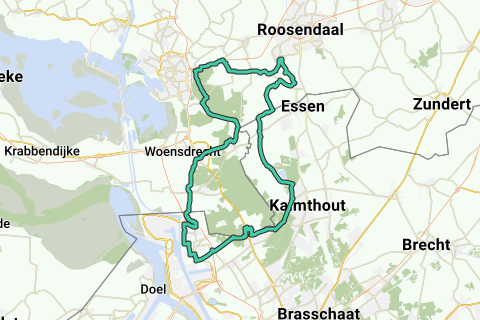 De Biezen - Zandvliet - Ossendrecht - Calfven - Hoogerheide - Kooiweg – Huybergen – Huijbergsebaan - Brasserie Bozlust - Vijfhoek - Wouwse Hil - Brembosch - Everland - Nispen – Bergsebaan – Mariabaan - Essen Hoek – Verbindingsstraat - Kalmthoutse Heide - Putte - De Biezen.