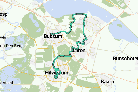 The route starts in Bussem (train station) and ends at the train station in Hilversum.