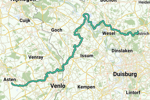 Through Neerkant, Evertsoord, it goes around Sevenum towards Lottum. The Maas is crossed by the Lottum - Lomm ferry. Afterwards, the NP Maasduinen is crossed through the hamlet of Hanik and the nature reserve Straelensbroek. Directly east of Arcen, the Netherlands is left behind.