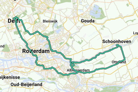 Circular route from Delft to Kinderdijk, then a tour around, back to Kinderdijk along the Lek and then back to Delft through Rotterdam and along the Schie.