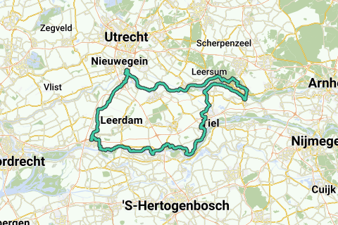 From VEG De Ark Gorinchem, via Papland to Dalem and there the Waaldijk, Waalbandijk to Tiel. Through Tiel to Maurik, from there over the Rijnbandijk, Marsdijk over the bridge to Rhenen. The Utrechtse heuvelrug, where we stop for coffee at Castle Amerongen. Then along the Lekdijk past Wijk bij Duurstede to Nieuwegein. There we cross the Lek again and drive along the Merwedekanaal to Arkel and back to the Ark.
