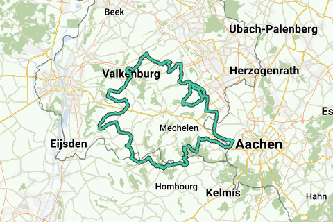 Round trip Heuvelland 58 from Vijlen. Start/finish: forest café 't Hijgend Hert, Rugweg, Vijlen. Climbs: Rue de Beusdael Sippenaeken (B) 1,300 m., max. 7.0%. Plankerweg Teuven (B) 1,400 m., max. 8.0%. Kütersteenweg Noorbeek 1,100 m., max. 7.0%. Emmaberg Valkenburg 1,500 m., max. 5.0%. Hooggats Voerendaal 2,400 m., max. 8.0%. Klingeleberg Simpelveld 1,600 m., max. 10.0%. Schneeberg Lemiers (D) 1,900 m., max. 9.0%. Harles Vijlen 700 m., max. 9.0%. Rugweg Vijlen 1,200 m., max. 8.0%. Elevation gain: 1,100. Coffee stop: café 't Heukske, Wilhelminaplein 4, Hulsberg (closed on Mondays).