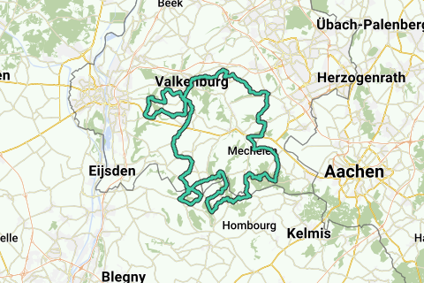 Scenic tour Heuvelland 71 from Vijlen. Start/finish: forest café 't Hijgend Hert, Rugweg, Vijlen. Climbs: Smidsberg Epen 1,500 m., max. 7.0%. Rue de Beusdael Sippenaeken (B) 1,300 m., max. 7.0%. Kloosterhofstraat Teuven (B) 2,000 m., max. 6.0%. Gieveld Teuven (B) 1,500 m., max. 6.0%. Schilberg Slenaken 1,200 m., max. 12.0%. Krindaal/de Planck Veurs (B) 1,600 m., max. 10.0%. Kütersteenweg Noorbeek 1,200 m., max. 5.0%. Sint Antoniusbank Bemelen 1,500 m., max. 9.0%. Bundersberg Cadier en Keer 1,100 m., max. 10.0%. Goudsberg Valkenburg 2,400 m., max. 7.0%. Kelderweg Eys 900 m., max. 13.0%. Hilleshagerweg/Vijlenberg/Rugweg Mcehelen/Vijlen 5,200 m., max. 8.0%. Elevation gain: 1,278. Coffee stop: café 't Plateau, Gasthuis 2, Bemelen (closed on Mondays)