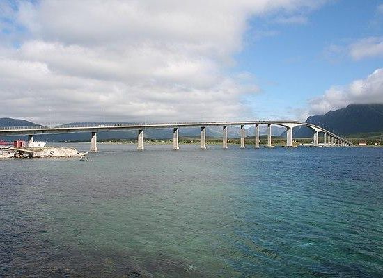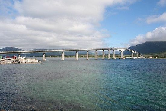 The Sortland Bridge is a cantilever road bridge that crosses the Sortlandssundet strait between the village of Strand on Hinnøya island and the town of Sortland on Langøya island. It is located within Sortland Municipality in Nordland county, Norway. The bridge is 948 metres long, the main span is 150 metres , and the maximum clearance to the sea is 30 metres . The bridge has 21 spans.